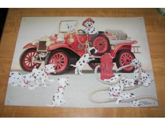 Measuring 17" wide x 12 1/2" tall, this cute tin sign features a firetruck with one adult dalmation looking after 8 rowdy puppies. What a cute addition to any room, for young & old alike.