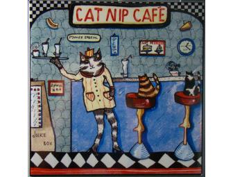 Fron Wendy Costa studio, this fanciful Cat Nip Cafe tile is a funky and functional trivet.