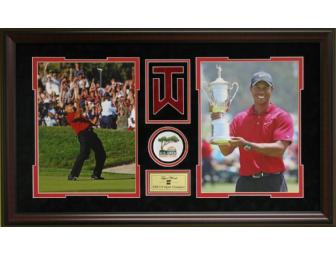This beautiful collage comes with two photographs of Tiger Woods celebrating his improbable victory at the 2008 US Open and includes a detailed Name Plate, US Open Torrey Pines Patch and Tiger Woods logo. This Item is framed in a Museum quality cherry frame with black mat. Measures 30x22.