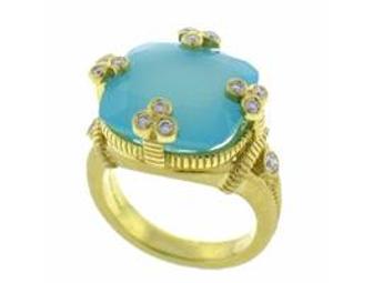 JUDITH RIPKA 18K GOLD CUSHION OLIVIA BUTTON RING W/ ROSE CUT BOTTOM SEA BLUE CHALCEDONY & DIA WEIGHT 0.26 CT