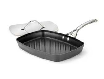 Bring the popular panini to your home kitchen with the Calphalon Contemporary Nonstick Panini Pan and Press. The rectangular nonstick pan has grill ridges for perfectly pressed and grilled paninis of any kind. Made of stainless steel, the panini press is evenly weighted for pressing sandwiches thick and thin. It can also be used as a small-sized stovetop grill for convenient, indoor grilling. (Note: item is new, without original packaging).