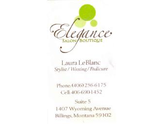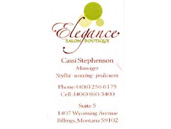 This beautiful gift basket has been prepared by the ladies of Elegance Salon & Boutique in Billings, MT. One of Billings' newest salons, you will immediately be surrounded in elegance and warmth when you choose to be pampered. This gift basket includes: A haircut by Lisa Horton, an eyebrow waxing with Laura LeBlanc, a half-hour massage with Teresa Thormahlen, sterling silver Sue Huston earrings, blackberry oak Wood Wick Fusion candle, Natural Beauties hair care travel kit and a blackberry oak Wood Wick Reed Diffuser. This package totals more than $200 in value. Donated by: Elegance Salon & Boutique, Cassi Stephenson, Teresa Thormahlen, Laura LeBlanc and Lisa Horton, Billings, MT (406) 256-6175.