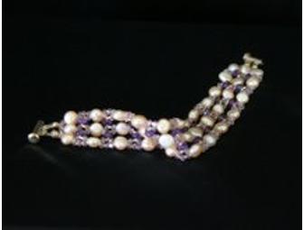 Who wouldn't love this stunning, handmade, one-of-a-kind pearl bracelet? Made up of freshwater pearls, Swarovski crystals, amethyst, seed beads and a gold-filled clasp, this bracelet is a real gem.
