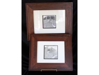 Enhance your art collection with this pair of custom-framed, double-matted pen and ink pieces by artist Alix Reeves: "Lone Eddie" and "Women by the Water".