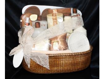 Wonderful spa basket includes bath powder, soap, body lotion, body spray, cream bath, hand soap, bath soak, bath salt, and bath caviar in vanilla and ginger fragrance. Also includes soap dispenser, fragrance pillow, soap dish, slippers and notebook.