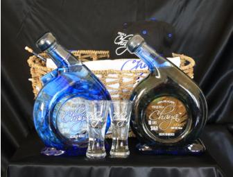 Two bottles of Chaya Tequila. two Chaya shotglasses and a Chaya t-shirt and hat.