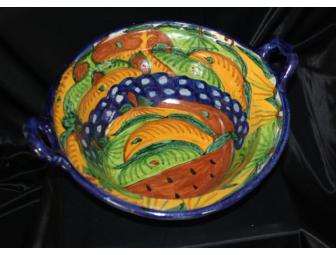 This beautiful large Talavera bowl in blues and greens shows the grace and warmth of Mexican and European influences.