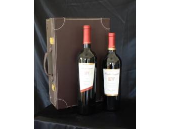 Two bottles of Beaulieu Vineyard wine. One is a Reserve Tapestry red wine from Napa Valley 2004, the other is a Merlot from Rutherford, again in the Napa Valley, 2004, all in a handsome leather case.