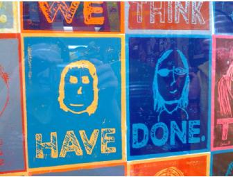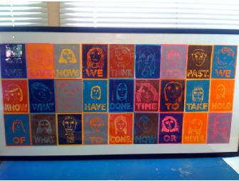 The kids wrote a 26-word poem together and then created individual self-portraits on styrofoam sheets. The portraits each have one word of the poem on them and were printed creating two-color prints. The prints were professionally mounted and framed by Frame Crafters to create a unified, colorful work of art with a relevant poem. Please visit the classroom to see in person (photo coming soon!).