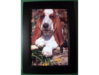 Basset puppy photograph measures 11.5" x 7.5" and is framed in a black frame. Total measurement 15" x 11"