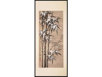 Gorgeous painting generously donated by the artist, Dr. Cathy Chan, of snow on bamboo. Ink and color on rice paper, silk mounted and framed abroad, the finished work measures 24 inches by 50 inches.