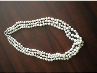 From the talented hands of Preparatory School teacher Susan Jarvis comes this incredible 24-inch three-strand necklace of over 200 luminous popcorn pearls, hand-knotted on silk and closed with a sterling clasp. Designed to be twisted tightly to a finished length of 22 inches. Worn loose or twisted, this unique item is a classic must-have addition to your jewelry wardrobe.