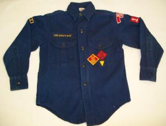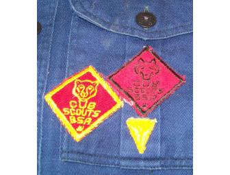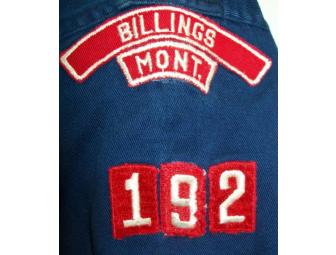 This official Cub Scout long sleeve uniform shirt features 1950's Wolf and Bear badges, and Gold Arrow Point on the left pocket. The right shoulder has a "Den 2" patch and the left has "Billings, MONT, 92". All patches are in excellent condition except for the arrow, and the pack numerals.