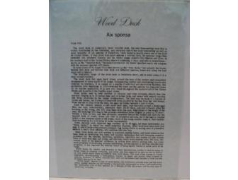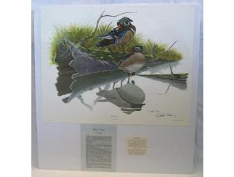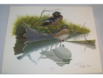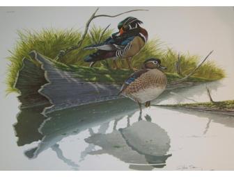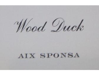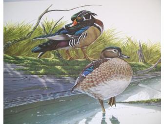 “The wood duck is America’s most colorful duck,” “’Wood Duck’” depicts a pair of wood ducks – the brilliantly colored male and the more softly shaded female – on and beside a log partially submerged in water, and emphasizes the distinctive role of this species as a denizen of both the waters and the tree tops of American lowlands.”
