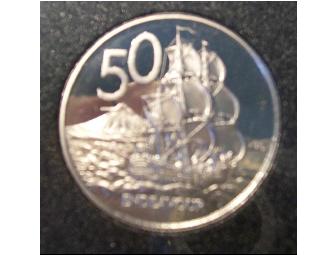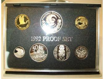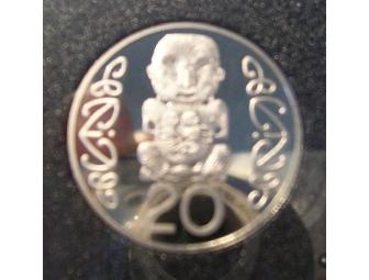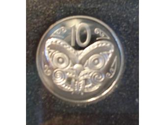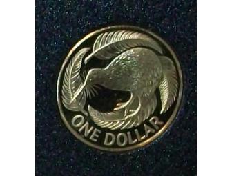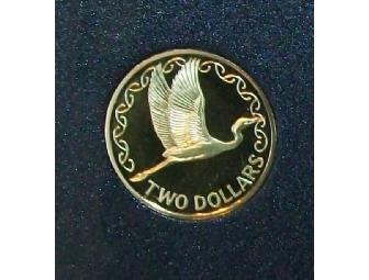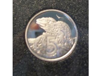 This rare coin proof set consists of six coins from New Zealand: Two dollars, one dollar, fifty cents, twenty cents, ten cents and five cents. The first two coins are sterling silver, and the remaining are cupro-nickel.