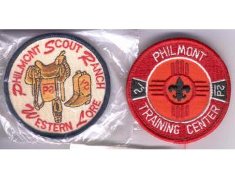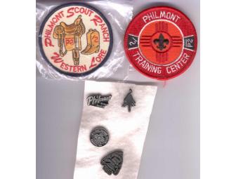 This includes two Philmont patches: Philmont Training Center and Philmont Scout Ranch Western Lore, and four hat pins representing each of the symbols of Philmont
