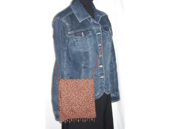 This beautiful rust floral beaded bag is great with jeans...holds the essentials. Has an interior pocket and a magnetic clasp. The braided strap is 44" long.