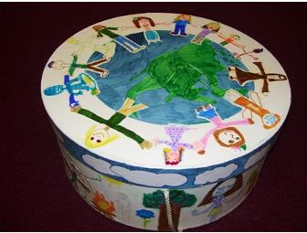 Hat Box - Nicole's students each created drawings which are included on this fun storage (hat) box. Colorful figures circle a globe on the box top, with trees, flowers and sky circling the box base.
