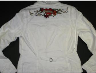 This unique white cotton women's jacket features a front zipper, standard collar, two front zipper pockets, two front buckle pockets as well as a back buckle half belt. The art on the back of the jacket is the "crimson heart and roses" design. Women's size: Medium