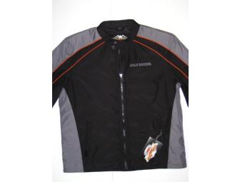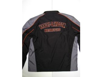 This men's black nylon jacket features a mandarin collar, front zipper and two front zip pockets. Accents of gray and orange stripes as well as "Harley-Davidson Motorcycles" embroidered across the upper back make it a great looking jacket for all kinds of weather. Men's size: Large