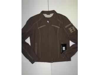 This stylish women's olive color jacket will look great no matter who is wearing it. Features include a mandarin style snap collar, front zipper, four front zip pockets, snap bottom waistband, zipper up sleeves and a unique embroidered stitch and stud Harley-Davidson design on the back. Women's size: Medium