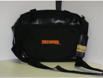 Harley enthusiasts will want to carry this Harley-Davidson black canvas briefcase style bag to meetings or while traveling around town. The bag features many zipper compartments for paperwork, files, or even a laptop. A shoulder strap and short handles make it easy to carry. The words "Harley-Davidson" are embroidered on the front.