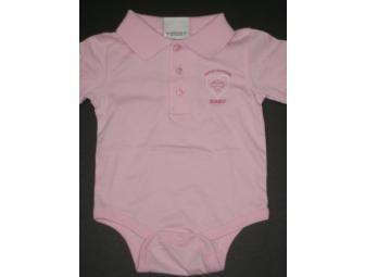Any baby girl will look adorable in this pink onesie. There is a standard collar and three buttons in front that button over diaper area. Artwork features a Harley-Davidson Bar & Shield in a heart and the words "Harley-Davidson Baby" on the right crest area. 100% cotton. Size: 18 months