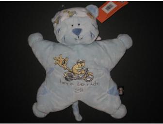 This soft and cuddly baby blue toy is perfect for your baby boy to cuddle with in his crib, playpen or car seat. The stuffed toy has an adorable face, a "rattle" in his head and darling "born to ride" embroidered graphics on his belly. A must for any little boy.