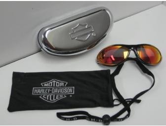 Protect your eyes when riding the open road with these Harley-Davidson Journey goggles. The orange tint lenses look great in the orange and black colored frames which also feature yellow & orange flames on the bows. Also included is an adjustable hanging band, cloth case and a hard chrome case.