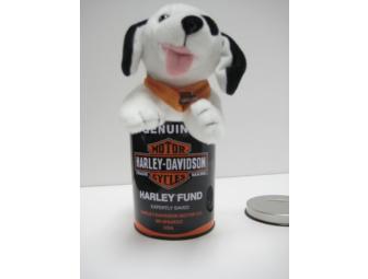 Children of all ages can begin saving their money in this Harley-Davidson tin can bank. Hiding inside the tin can is an adorable stuffed white & black puppy wearing a Harley-Davidson bandana.