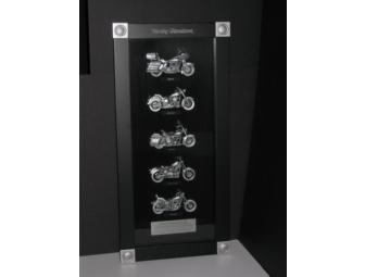 This framed shadow box has five different motorcycles of the 1980s. Each motorcycle is pewter in color and featured in a three dimensional view. A plaque at the bottom of the framed piece describes the motorcycles shown. Each corner of the frame has a pewter looking square corner cap that displays the Harley-Davidson Bar & Shield. This classic black and pewter piece would look stunning in any room in your home.