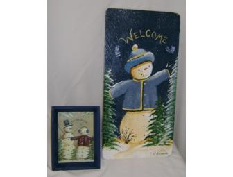These snowman items will look great in any decor! Greet your guests on a snowy day with this welcome sign. The small snowman painting says "Love the Season" and is easy to stand up on a table or counter.