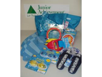 Summer Fun pack includes 2 pairs kids goggles, boys flip flops size 13-1, girls flip flops size 1-2, sand scoops, inflatable swim ring, dive rings and 4 fish plates all in a roomy nylon beach bag.