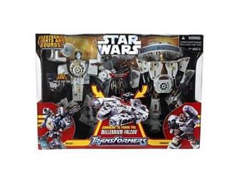 Two worlds collide - Star Wars and Tranformers! Two of the greatest Star Wars characters, Han Solo and Chewbacca, combine together to form one of the most recognizable space vehicles of all time - the Millennium Falcon!