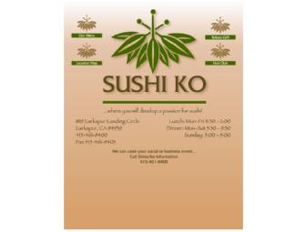 $100.00 gift certificate to Sushi Ko Restaurant located at 1819 Larkspur Landing Circle, Larkspur, CA.