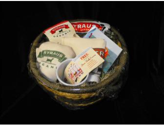 Basket from Straus Family Creamery. Items include mug, shirt, bag, two glass milk bottles and three coupons for your choice of milk, ice cream, yogurt, butter.