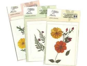12 card assortment. Made by hand from native plants of the Himalayas, these notecards of simple beauty represent a woman's hope for the future. Every card is unique, reflecting the creative vision of the artisan who selected each flower and frond. Natural paper embedded with real flowers and leaves complement your personal message. The women of the Himalayas thank you for your purchase and hope for your continued support.